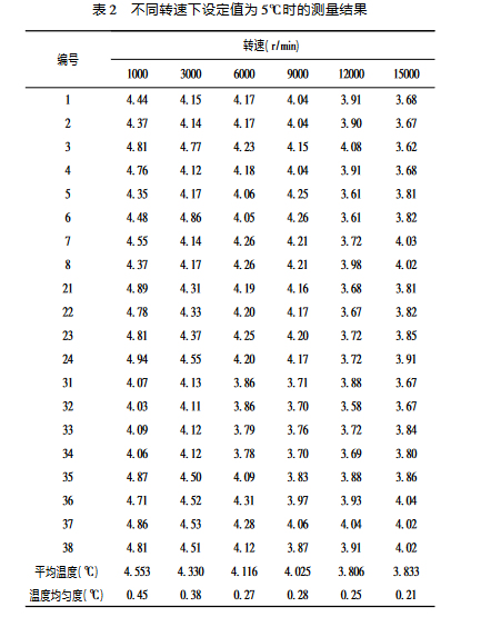 將溫度傳感器按照?qǐng)D 1 所示固定在高速冷凍離心機(jī)腔體相應(yīng)位置,打開離心機(jī),設(shè)置溫度為 5°C ,轉(zhuǎn)速為 1000 轉(zhuǎn)。離心機(jī)開始運(yùn)行,待轉(zhuǎn)速和溫度達(dá)到設(shè)定值 穩(wěn) 定 后 開 始 度 數(shù),每 隔 2min 讀 取 一 次,30min 內(nèi)總共讀取 16 次數(shù)據(jù)。測(cè)量完成后,將轉(zhuǎn)速設(shè)定值改為 3000,6000,9000,12000,15000 分別進(jìn)行測(cè)量。測(cè)量結(jié)果如表 2 所示。